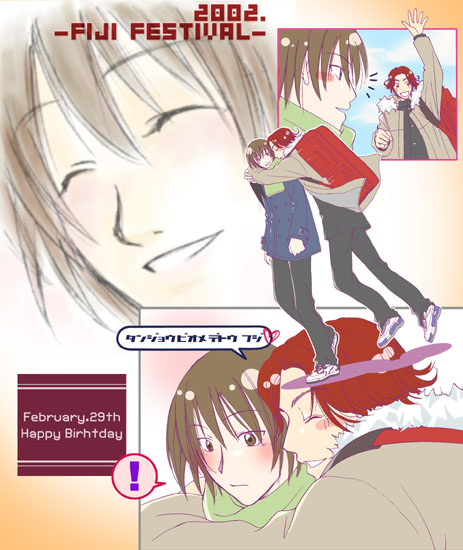 お絵書き掲示板を設置したのが02の1月の終わりの方…だったと思うので、初めの方は不二さんばっかり(笑)(誕生日近かったから)3-6オンリー云々言ってるのは02.2.17にあった3-6オンリーの事です。浮かれて一般参加した。桜のやつは3月かな